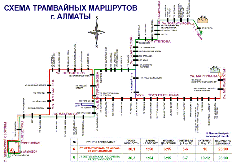 - Сатпаева - Джандосова - Шевченко - Космонавтов - Пастера - Кунаева